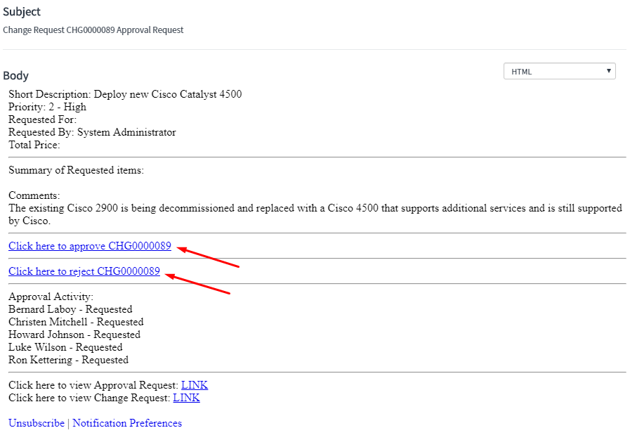 By default, when an approval is sent out from ServiceNow, the “Click here to approve” and “Click here to reject” hyperlinks in that email, are simply mailto: links with subject and body parameters.