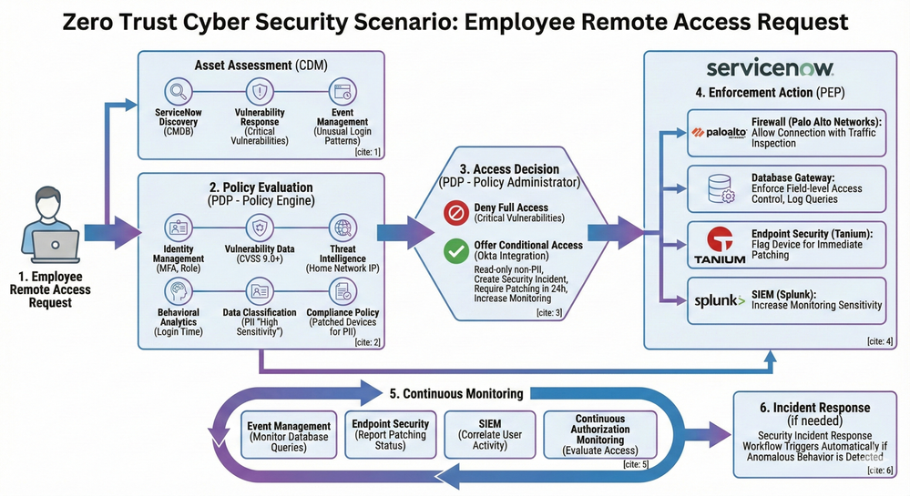 Strategic Value: By consolidating policy management, event correlation, vulnerability intelligence, and real-time monitoring, ServiceNow provides a unified decision framework that aligns with the NIST 800-207 vision for the PDP. Rather than forcing security teams to manually correlate data across disconnected systems, the platform delivers integrated intelligence to drive automated, risk-based access decisions.