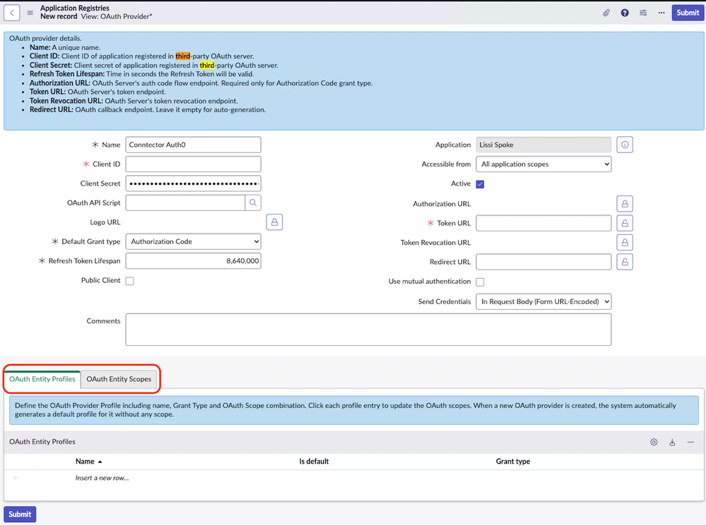 - Define the Profile and Scopes: In the OAuth Entity record, associate a profile with a grant type. Then, add scopes—these could be predefined like "email" or custom like "incident.read" for Table API access.