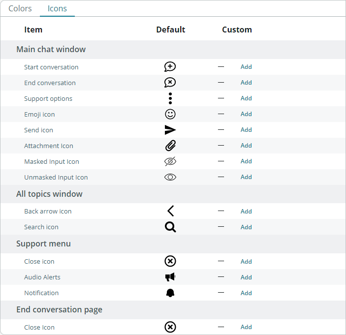 To customize chat icons, select the Icons tab in the "Customize color for each item below" area. From here you can add or replace a custom icon. If wanting to revert to the system default icon, you can simply remove the custom icon concerned.