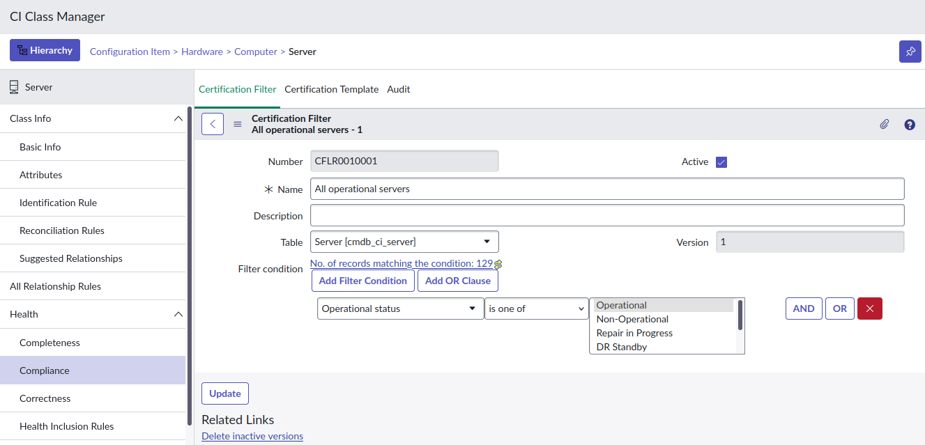 - "Operational status" denotes the operational or working status of the CI. This field is available for all CI classes, and is not synced between CI and Asset.