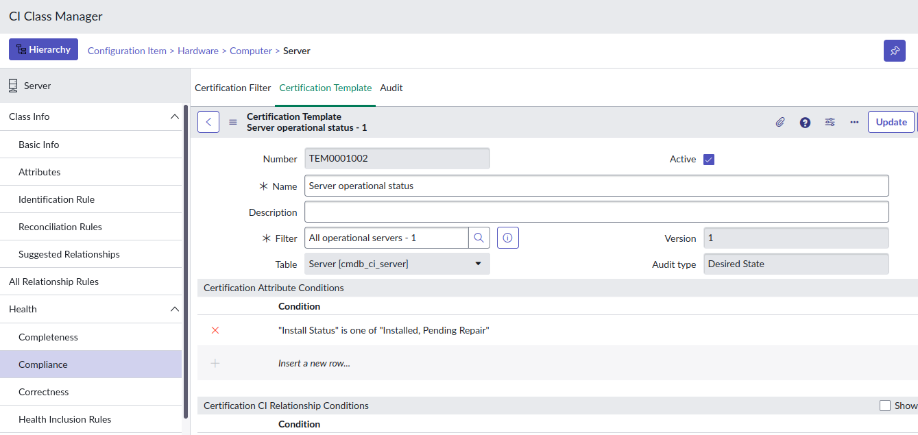 Here's an example that expects all Server CIs where the Operational Status is "Operational" to have the Install Status of either "Installed" or "Pending repair".