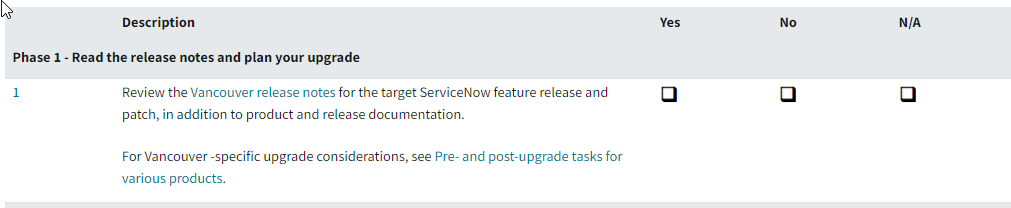 Think of this next part as 1a, in the same place you find the Checklist, ServiceNow has a list of pre- and post- upgrade tasks for each release. Find yours and read through the items and save yourself a whole lot of heartburn later. Or you can spend a couple of hours wondering what happened to your buttons only to read: “all the buttons on the assessments or survey cards have been removed.” 😮😫 So yeah - RTFM.