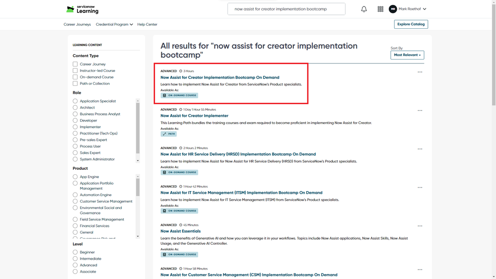 When logged in to ServiceNow Now Learning, search for "now assist for creator implementation bootcamp on demand". This is a free course, described as "Learn how to implement Now Assist for Creator from ServiceNow's Product specialists." As you might notice under the syllabus section, two parts are on hands-on labs! Hands-on, on a ServiceNow lab instance ![]()