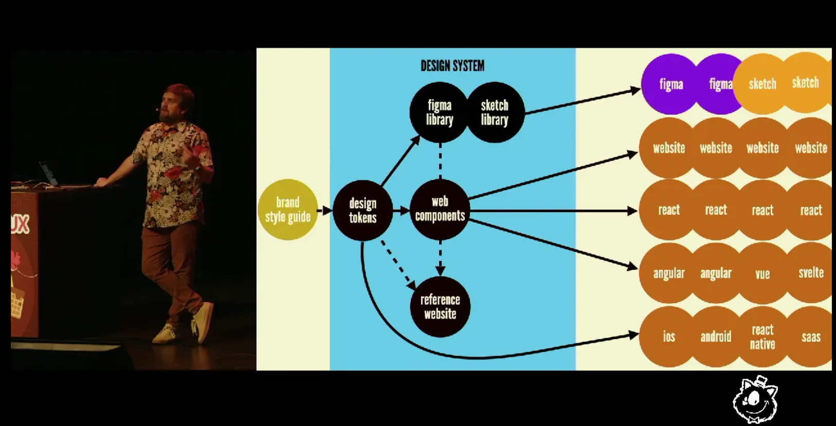 In the first part of the talk, Brad gave us a little WWW history starting from the first website all the way to web components. Then he summarized that design systems inform and influence products and vice versa.