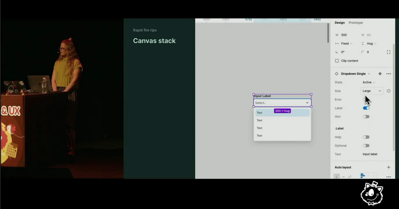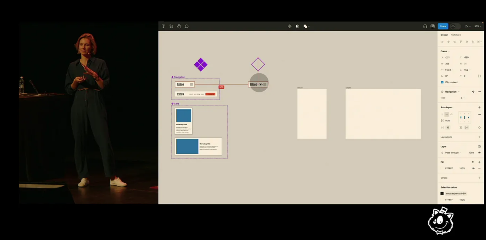 Christine’s talk was about pushing the current limits of Figma: how to do responsive design in Figma, e.g., by using the so-called container queries. These queries are like media queries, but we are not looking at the viewport size. Instead, we are looking at the container. So a component behaves differently if, e.g., it is inside a sidebar, and we can also nest container queries, e.g., tell an icon button inside a card that upon resizing, the icon should disappear).