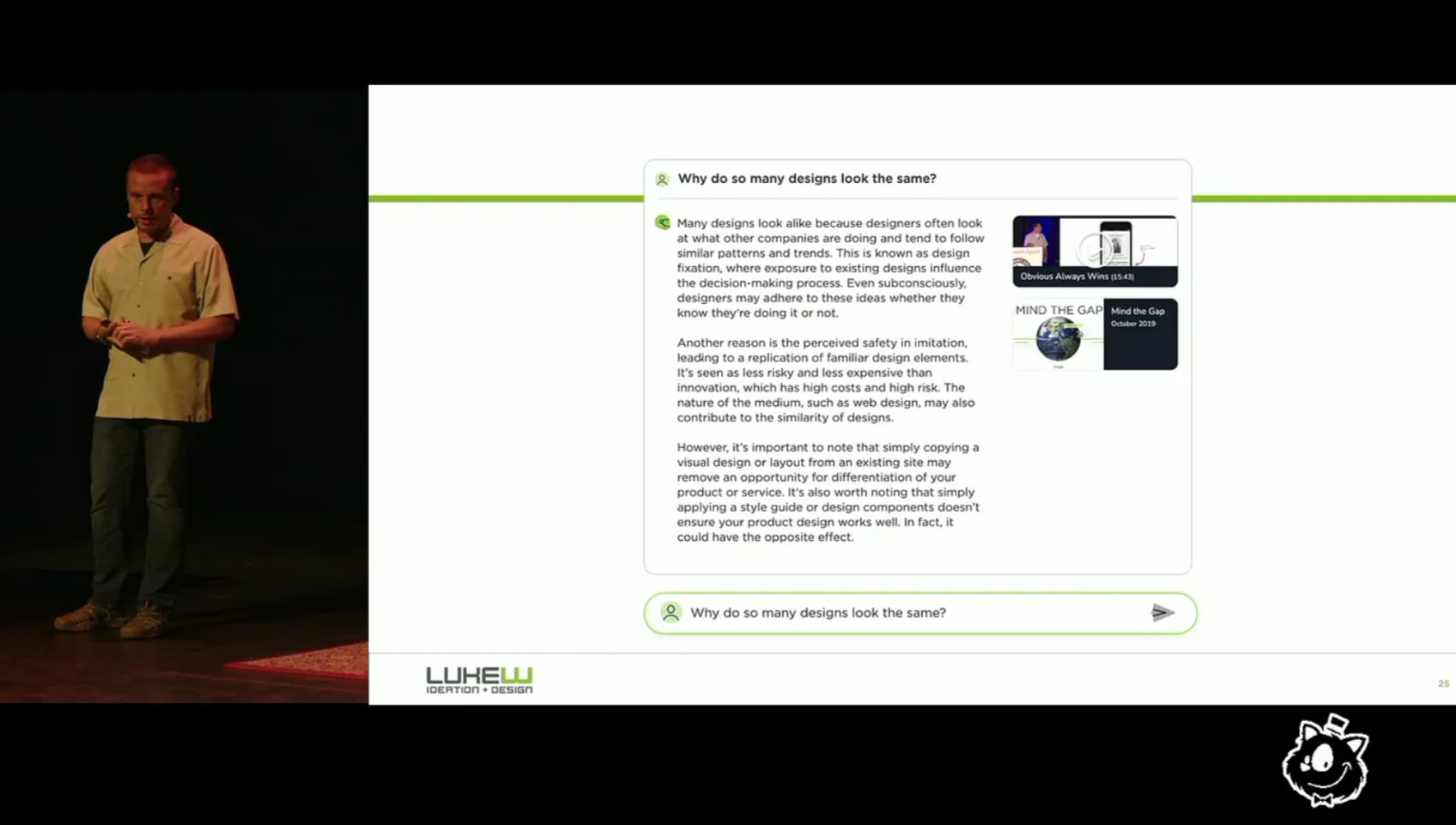 I have been following Luke Wroblewski since the early days of my design career. I read his book “Web Form Design: Filling in the Blanks” back in 2011, so I was really excited to attend his talk. Also, the topic of AI and design has been a hot one lately, so I was very curious about the conversational interface he created.