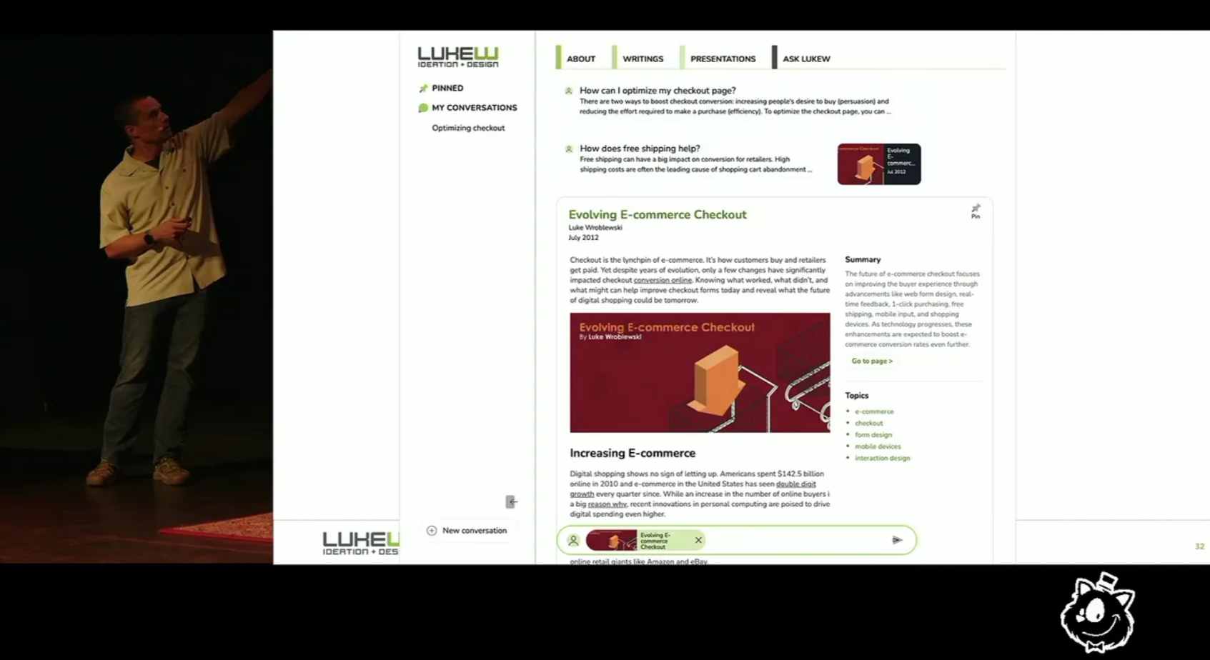Luke has been creating content for 27 years; for example, there are 2,012 articles on his website. There are also videos, books, and PDFs. He created an experience that lets us ask questions from AI that have been fed with this data (all of his articles, videos, books, and so on).
