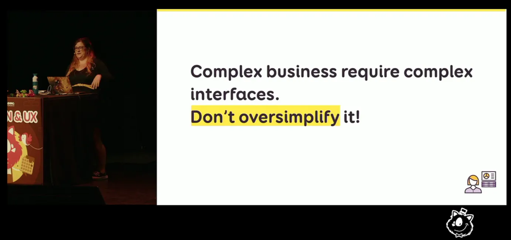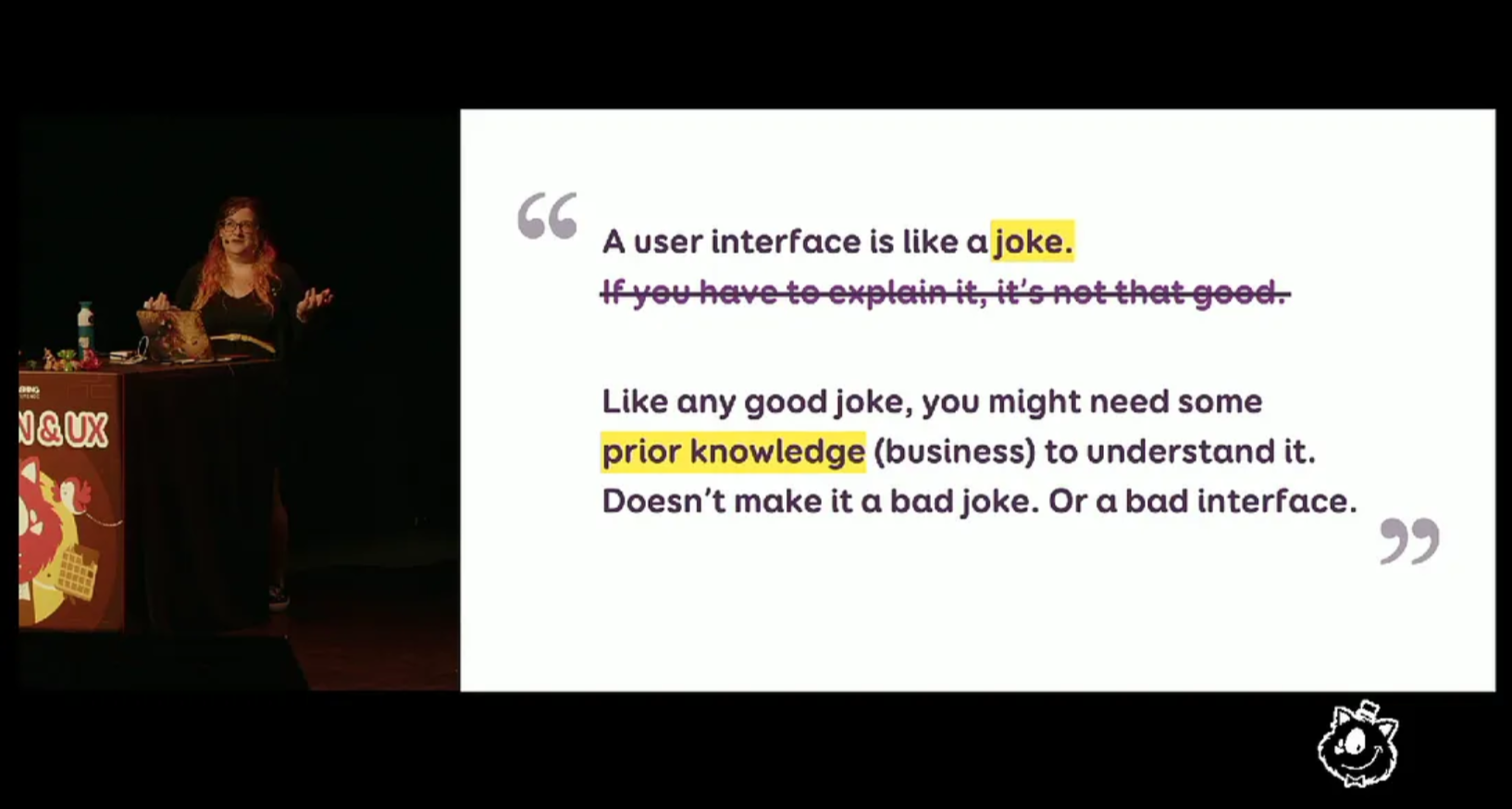 It was also very refreshing that she corrected the age-old saying about user interfaces: you know, the one that starts with, “The user interface is like a joke…”. The thing is, sometimes, we need some prior knowledge to understand a joke. This fact doesn’t make a joke bad. It is the same with user interfaces. Sometimes, we just need some prior knowledge to understand it.
