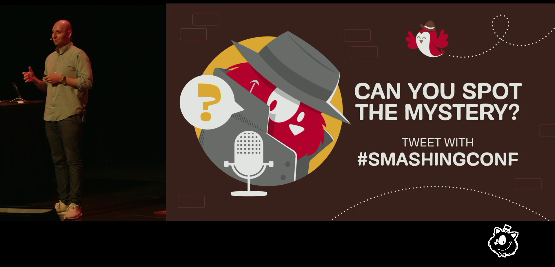 At the very beginning of the conference, Vitaly said hello to everyone watching online, so even though I participated remotely, I felt welcomed. :-) He also shared that there is an overarching mystery theme of the conference, and the first one who could guess it would get a free ticket for the next Smashing conference — I really liked this gamified approach.