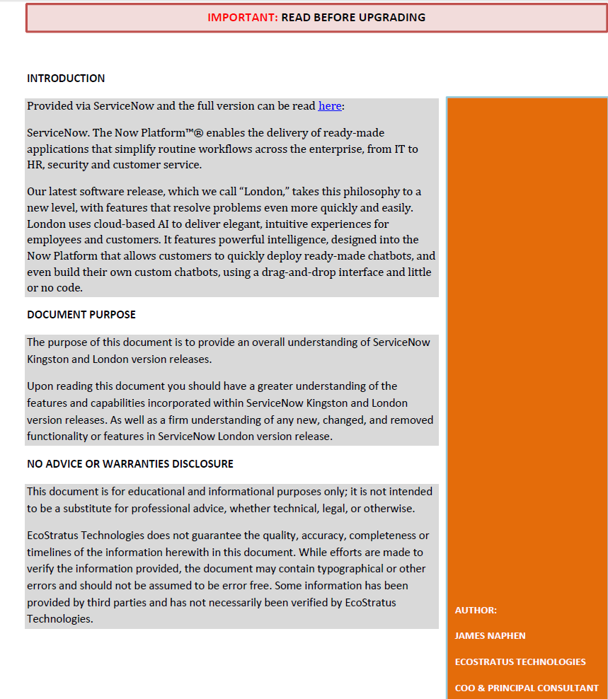 The proceeding is a sample of the full document, which is a more comprehensive side-by-side comparison, with a deeper review of the release notes provided by ServiceNow and sections that can be used to capture things such as – current state vs future state or potential risks and concerns that may need further investigation and/or analysis as they pertain to your organizational specific ServiceNow or IT environment needs as examples. I’m not going to spend time on the details of the full document but I’d be happy to connect with you and/or your organization and welcome invitations and opportunities.