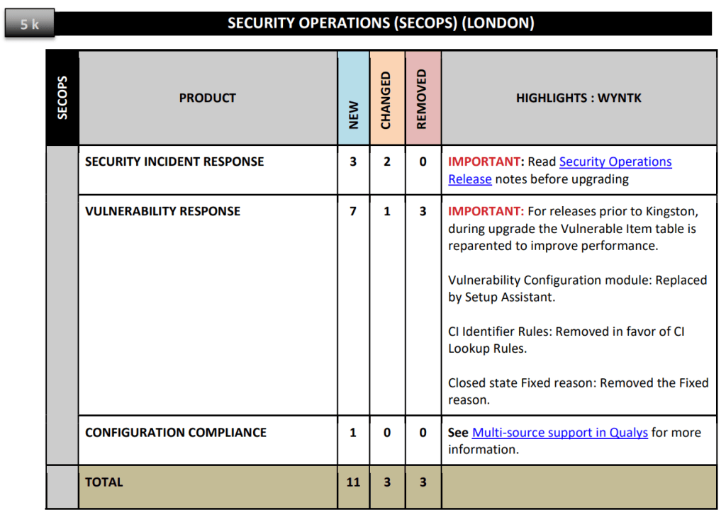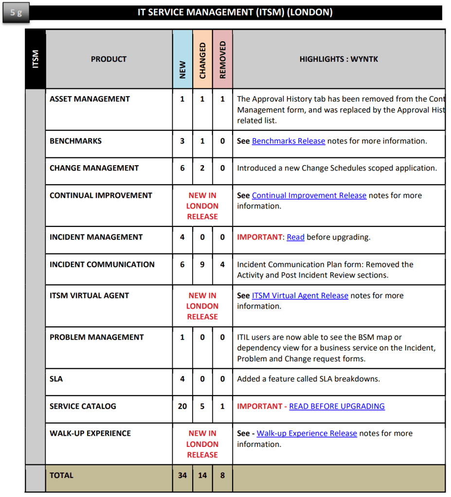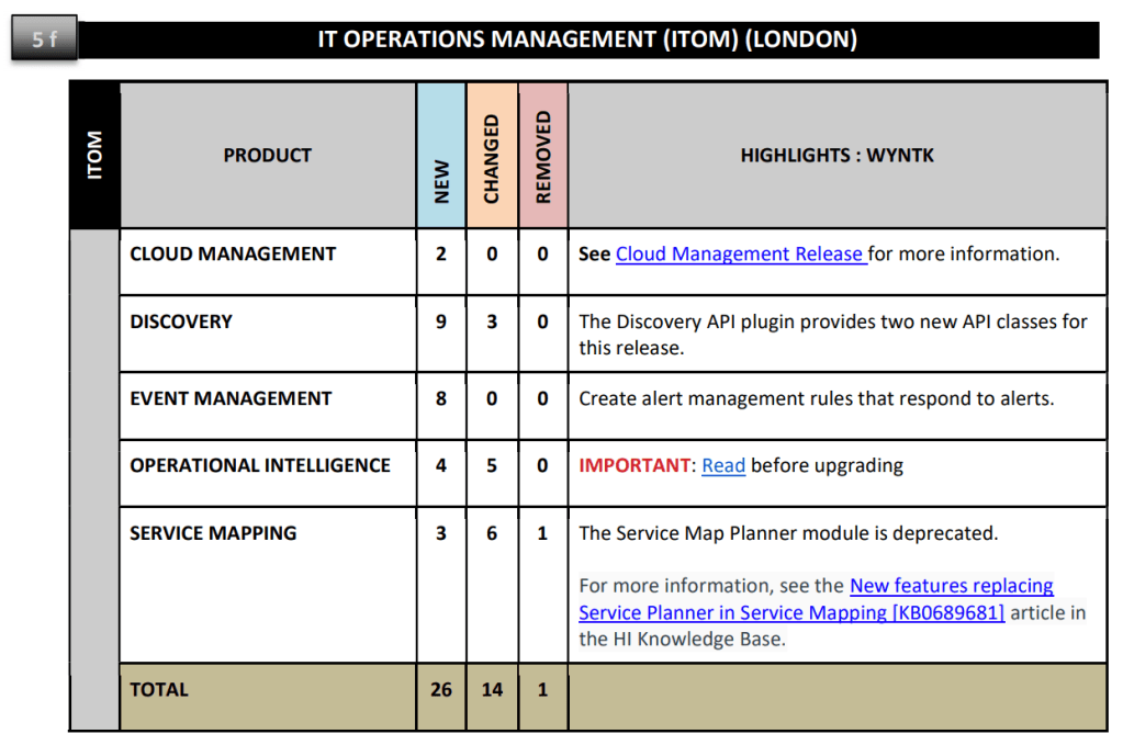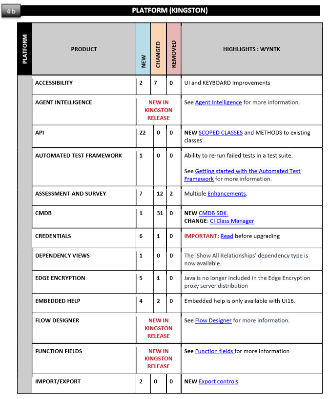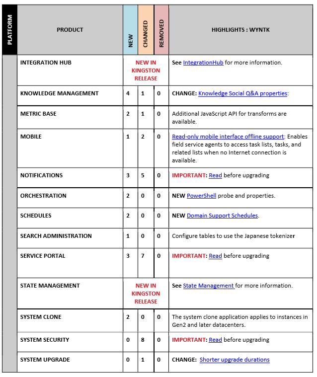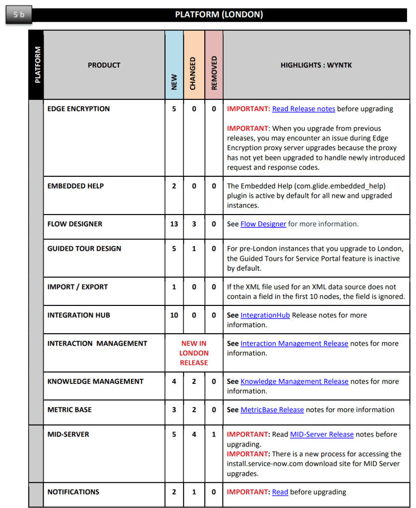In the Kingston and London family, ServiceNow features and products were introduced, updated, or removed. This is a great resource if for example you need to know if a feature or enhancement that you or your organization have been asking for is now included or if you need to go with plan B. However, its not ideal for understanding the differences between release versions.