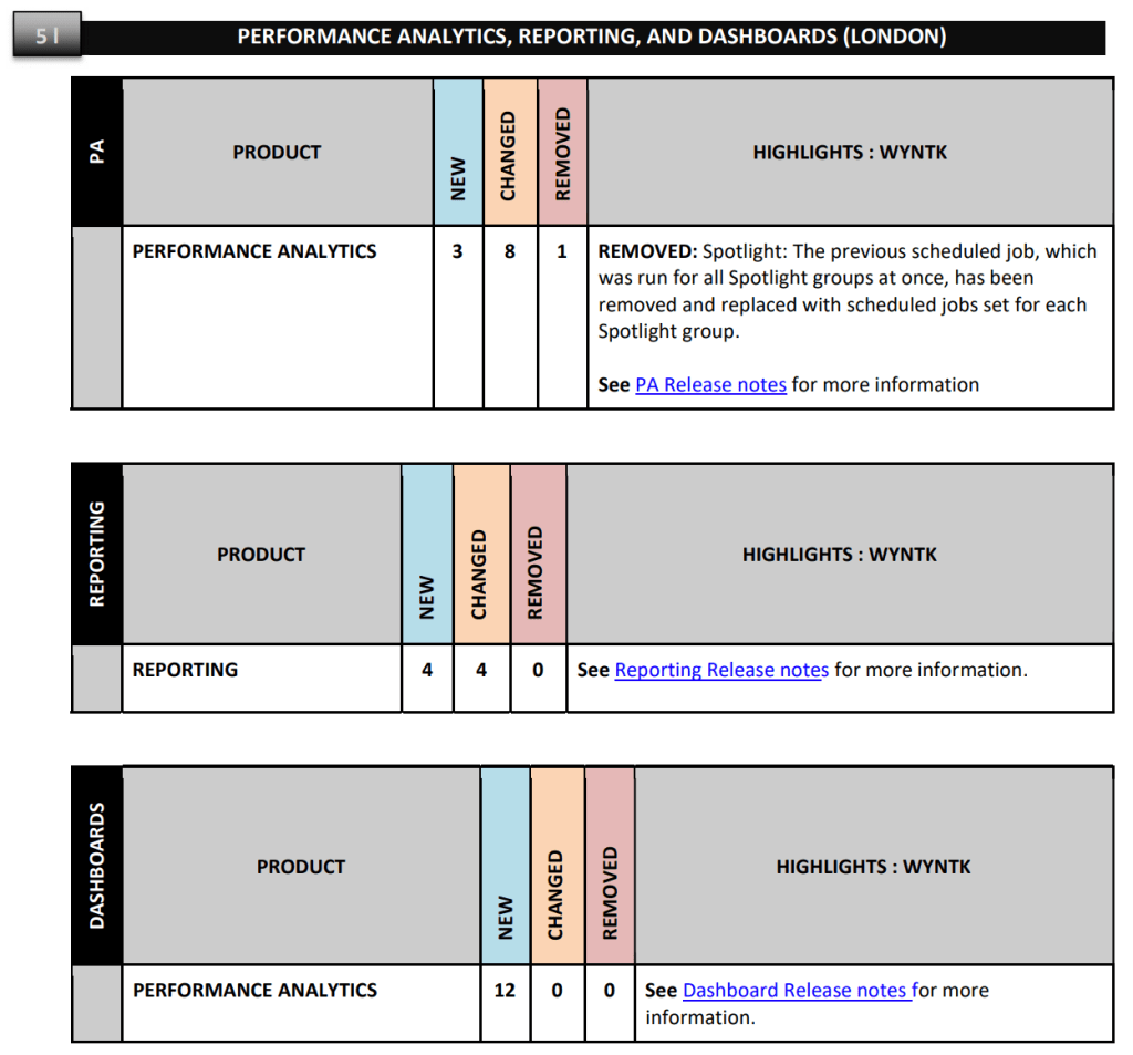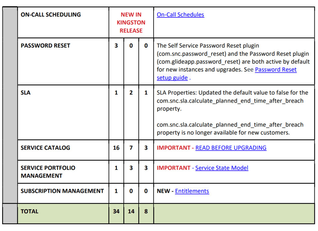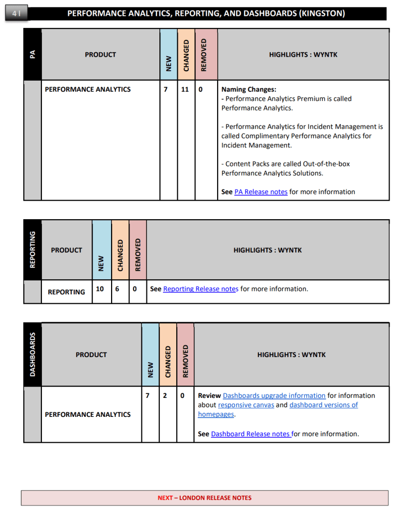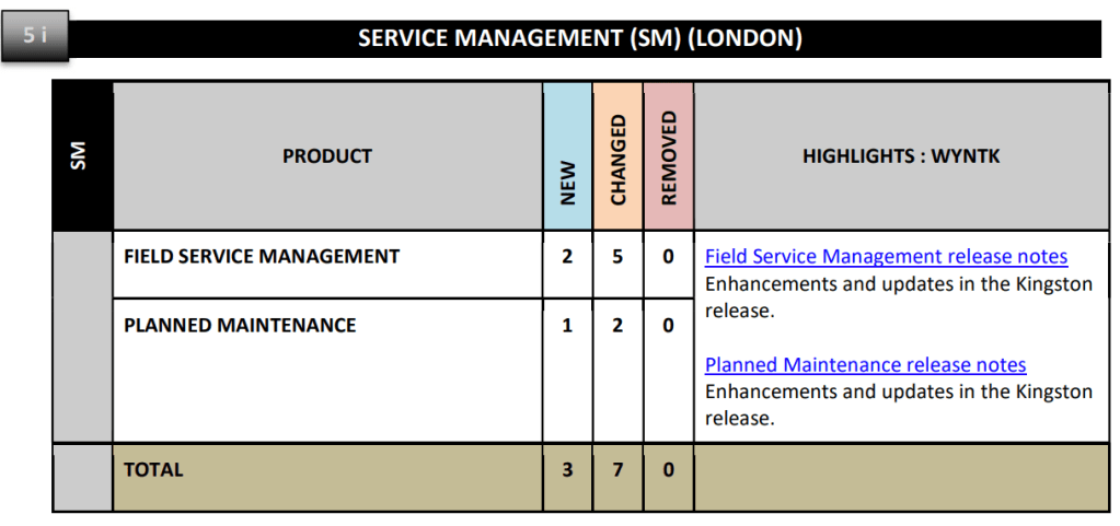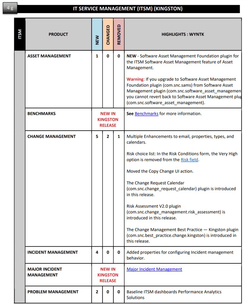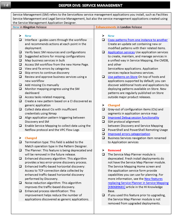 In the Kingston and London family, ServiceNow features and products were introduced, updated, or removed. This is a great resource if for example you need to know if a feature or enhancement that you or your organization have been asking for is now included or if you need to go with plan B. However, its not ideal for understanding the differences between release versions.