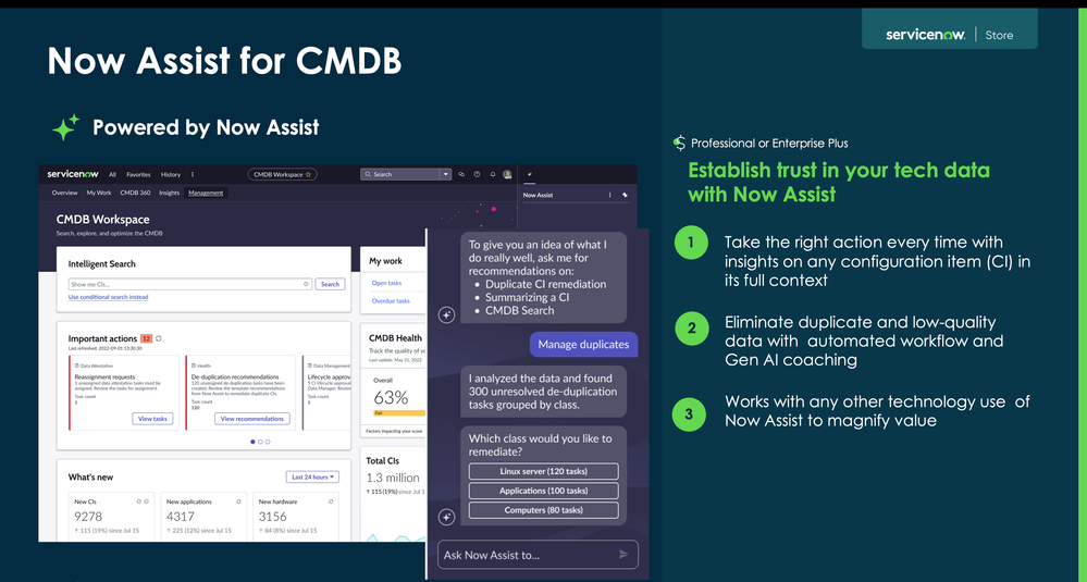 - Smart Duplicate Detection: Similar to how phones detect and suggest combining similar photos, Now Assist identifies and helps resolve duplicate CIs while preventing future occurrences. This includes the ability to leverage existing duplicate efforts and templates.